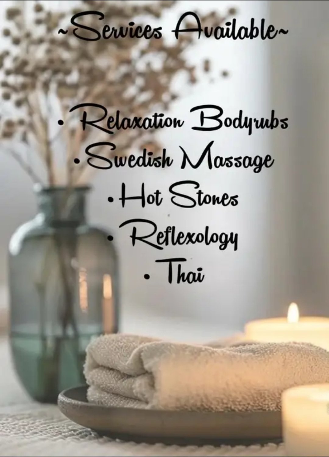 Let us spoil you Cozy Rooms Relaxing music Your choice of something soft & soothing medium relaxing touch or deep therapy with warm lotion hot stones hot towel treatments after this is full body pure pampering perfection with a combination of customized treatments for your body’s needs our attention is to focus only on you from start to finish